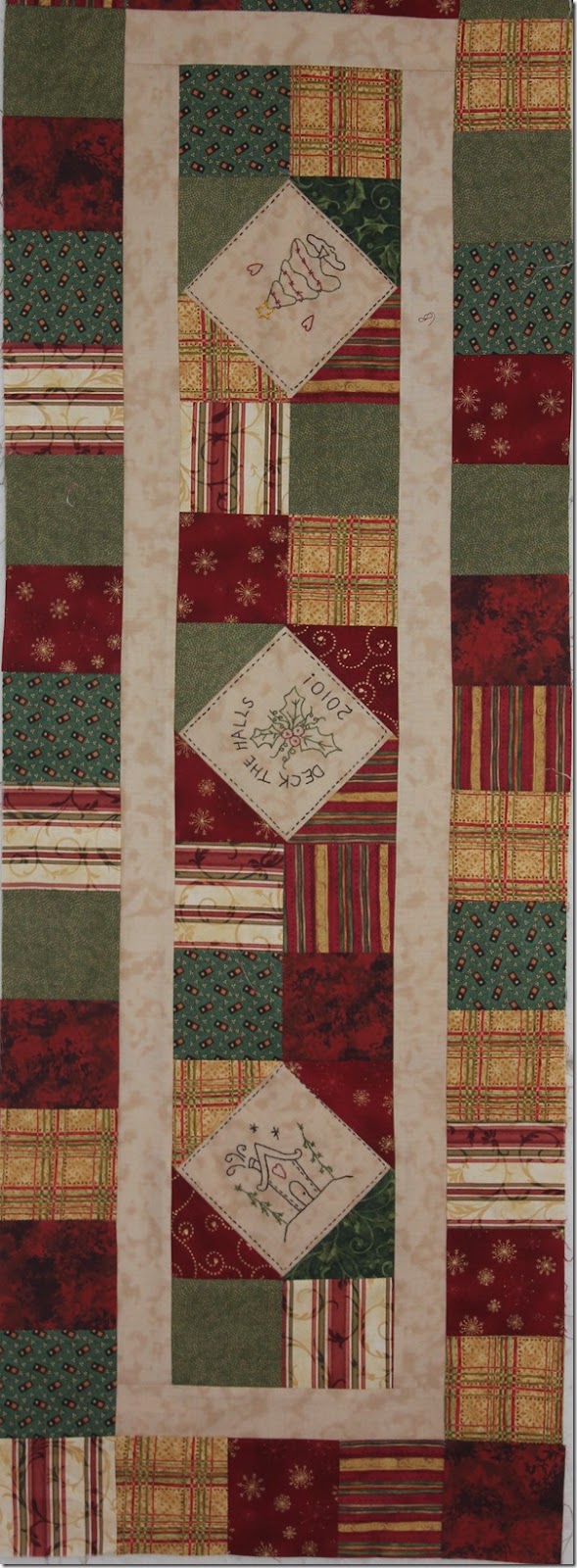 Here is a really pretty Christmas table runner that I made back in 2010 (obviously from the date on the stitchery). The pattern was from a Country Threads magazine, back when I was buying craft magazines.